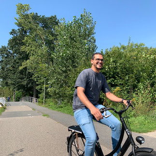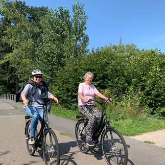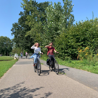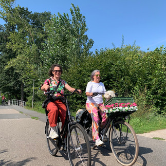 We were with 14 people to ride through memory lane in Rob’s hometown city; Rotterdam. When Hugo and I were together in Austria we made a pub quiz for all the stops we were going to stop. We had a lot of fun organizing this! We rented twelve bikes, Rob and I had our own ones, because I have a basket at the front of my bike for Ayo. You know, Ayo goes where we go, also this day.
