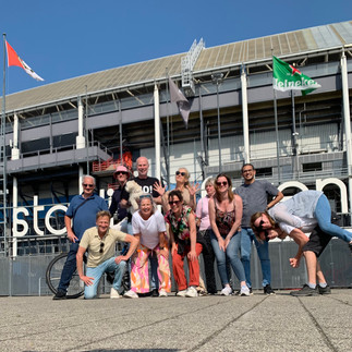 After the tennis a few of the ladies needed a toilet and we were thirsty and hungry. We stopped at a place that still existed, where Rob’s dad took little Rob sometimes for a drink after he went to the barber. From there Hugo and I decided to shorten the route a bit. We skipped the Erasmus university, we planned to take a water taxi to go there, because at a bar in the center more people gathered for the next surprise for Rob. So we rode to the place where Rob was born and lived till he was 23 years old. Then we saw the flat where his parents later lived and there we carried on in the direction of the center but of course with stopping at the best club of the Netherlands, Feyenoord, the Kuip.
