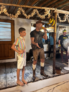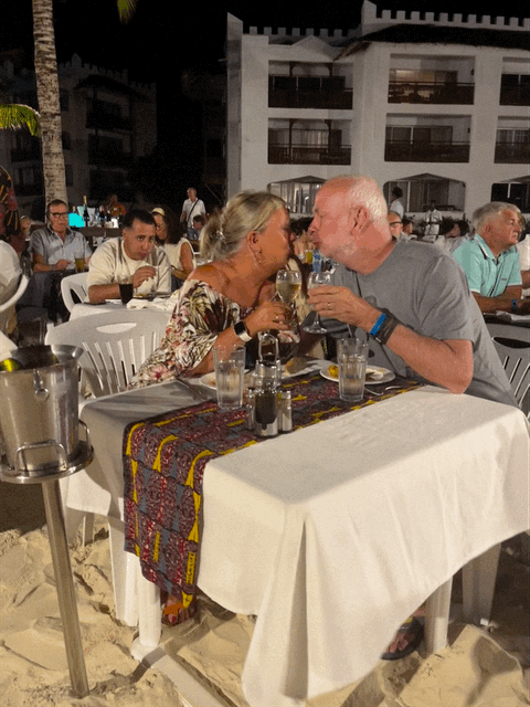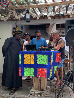 The next day was 'Wedding Day' day! In the morning, Rob and Dennis quickly went for a massage at Rose on the beach. We hung around the hotel, stayed close. Dana and Thil helped me with my hair as the hairdresser didn’t show up. It’s still Africa there and so you must be flexible! We saw the Maasai slowly building the arch of flowers, putting chairs on the beach, and brought out a party table for Mathilde who had the honours to wed the couple. The sun was out, wind was a bit too strong, everyone was cheerful, and in a happy and exciting mood. Moment supreme was there. I had the honour to walk our ‘adopted’ son down the aisle. We were all emotional. Nastyia came from the penthouse and had to walk down two stairs on the outside of the building. Her son, Rustam, was waiting downstairs for her and together they walked through the aisle. Mathilde spoke beautifully with the help of Dennis who held the microphone and tried to block the wind from the microphone with his hand. Then they gave each other their vows. Nastya did it perfectly. Patrick did it his way, at the end of his vows he sang, “realize, you’re living the golden hour”, the text we used on the canvas we gave them the evening before. Then Joop organized a surprise at the end of all the official parts, a group of Maasai came to dance. Uncle Nico and Antonello danced and jumped with them. Sanneke sort of danced around everyone to make the perfect shots. I think it’s a stressful job as it all goes so fast. After the ceremony, I assisted her with light on the beach. It was fun and I did my upmost best. After the ceremony, the happy couple took photos on the beach. We had a few drinks at the front side of the hotel. During dinner, Rob and Joop gave beautiful speeches. Nastya and Junior cut a stunning cake. In the evening, we danced the night away in the sand.