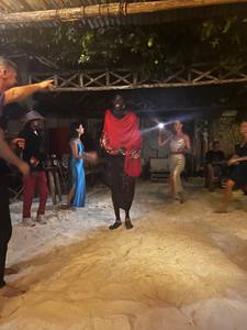 We were going to a beach club, but missed it, and went too far. Which gave us extra time on these boats, hurray! At the beach club, we had 'sex on the beach' cocktails, beers, and photos of the whole group, and we saw a stunning sunset! We went back by bus since at 6:15pm the sun sets and then it’s dark, really dark. Back at the View of Zanzibar, we had a Nigerian dinner and the 90ties party started where everyone was dressed up in fancy dresses.